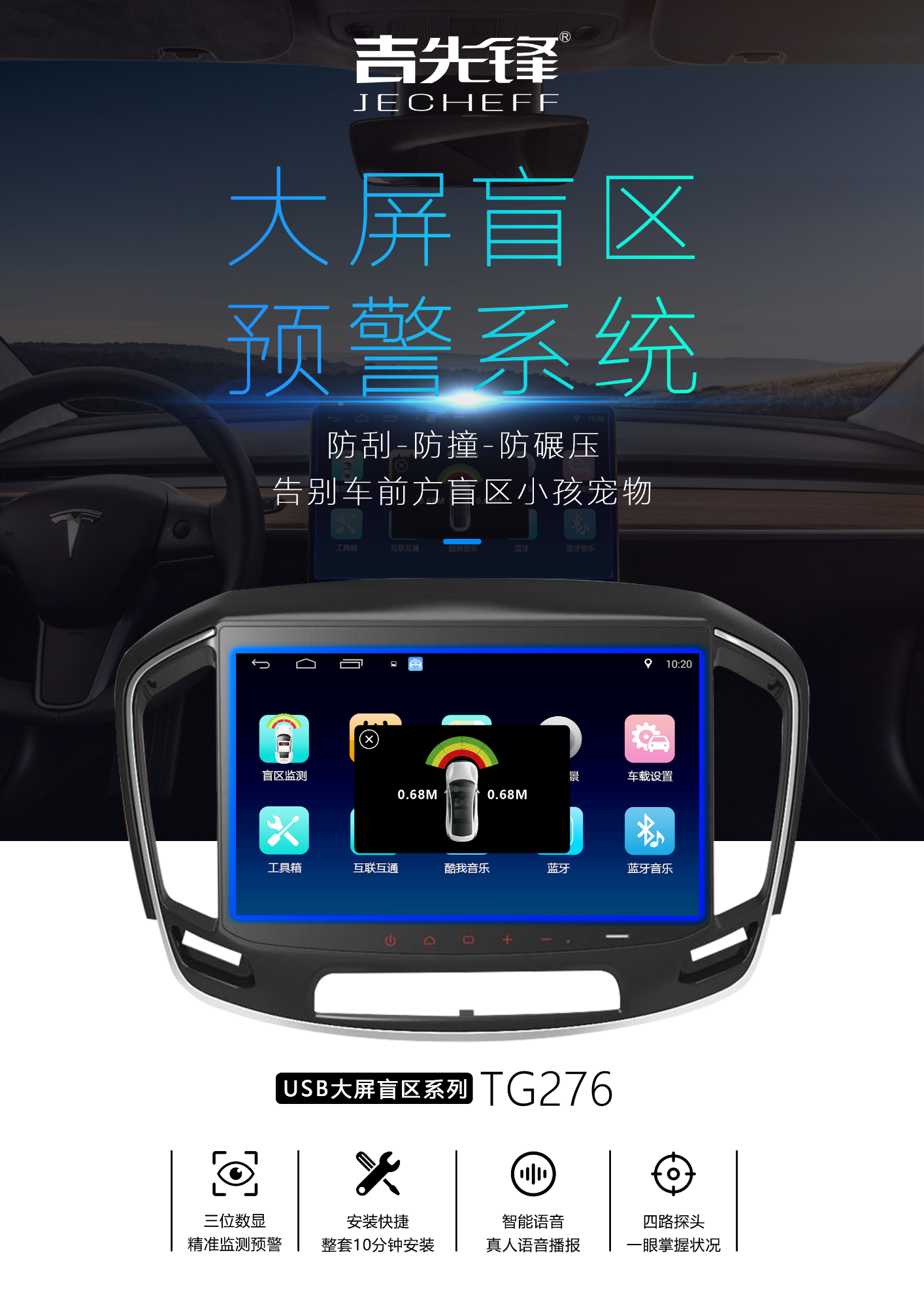安卓系統(tǒng)車機通用,安裝APK即可使用前盲區(qū)預(yù)警系統(tǒng)。十分鐘快速安裝。智能彈窗顯示,智能退出。